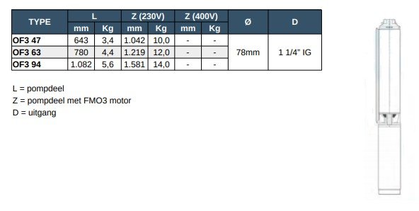 3″ bronpomp uitgevoerd in RVS 304 met noryl waaiers. Geschikt voor installatie in bronnen met een minimum (binnen-)diameter van 78mm. Zandbestendig tot 100gr/m3, dus ook te gebruiken in bronnen die een heel klein beetje zand geven. Deze pomp is ideaal voor tuinberegening en de perfecte vervanger van 1pk centrifugaal pompen.