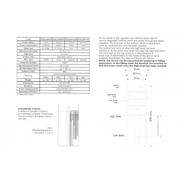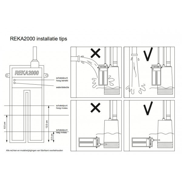 De regelaar kan zowel horizontaal als verticaal geplaatst worden. Bij verticale plaatsing wordt er geschakeld bij 1cm en 13cm waterhoogte, bij horizontale plaatsing is dit 1cm en 5cm waterhoogte.